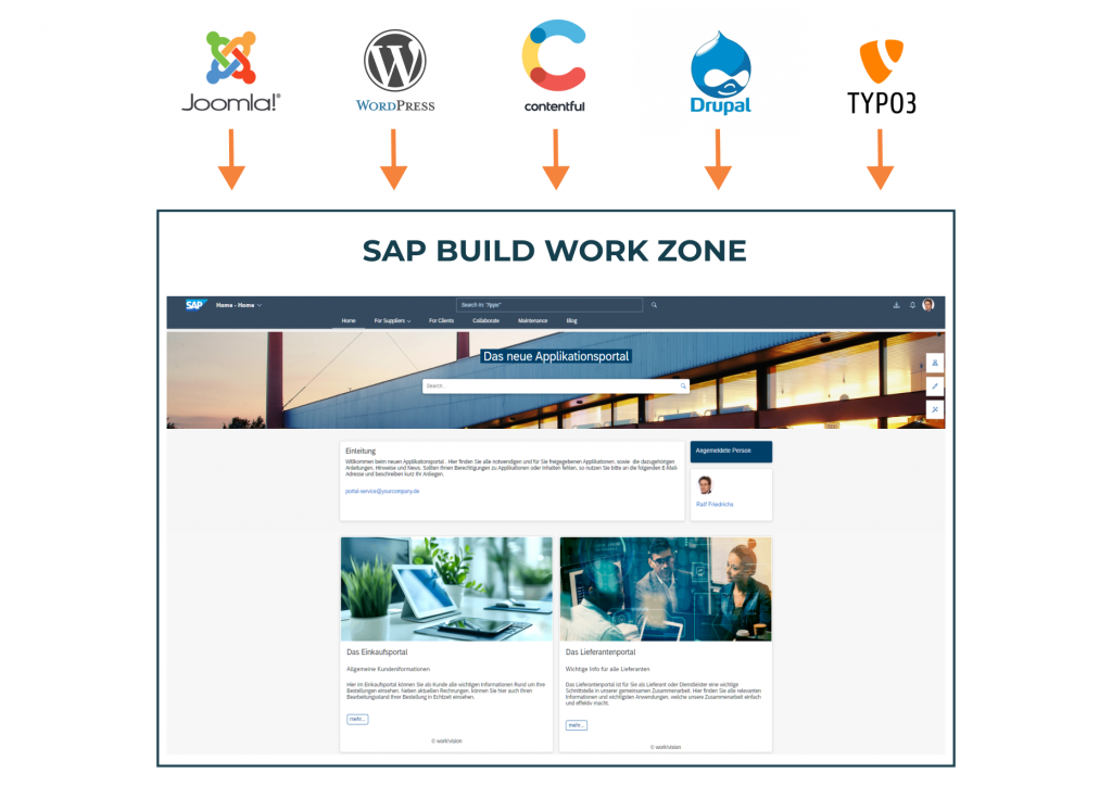Next Level Content Delivery mit dem CMS Smart Hub for SAP Build Work Zone. Verbinden Ihre bestehende CMS-Welt (z. B. WordPress, Typo3 oder Contentful) nahtlos mit der SAP Build Work Zone – ohne Ihre Redakteure teuer umzuschulen oder Inhalte neu zu strukturieren zu müssen. Wir zeigen Ihnen, wie man bestehende CMS an die SAP Build Work Zone anbinden kann. Schnell, einfach, sicher, effizient.